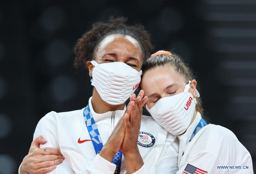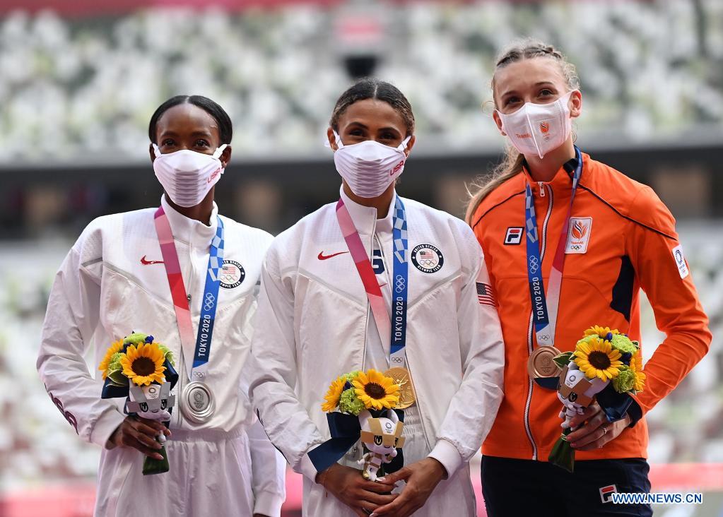 Gold medalist Gong Lijiao (C) of China, silver medalist Raven Saunders (L) of the United States and bronze medalist Valerie Adams of New Zealand react during the awarding ceremony of the Women's Shot Put at the Tokyo 2020 Olympic Games in Tokyo, Japan, Aug. 1, 2021. (Xinhua/Li Ming)