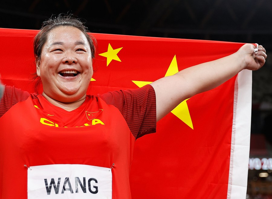 Gong Lijiao of China celebrates after winning the women's shot put final at Tokyo 2020 Olympic Games, in Tokyo, Japan, Aug 1, 2021. (Xinhua/Li Yibo)