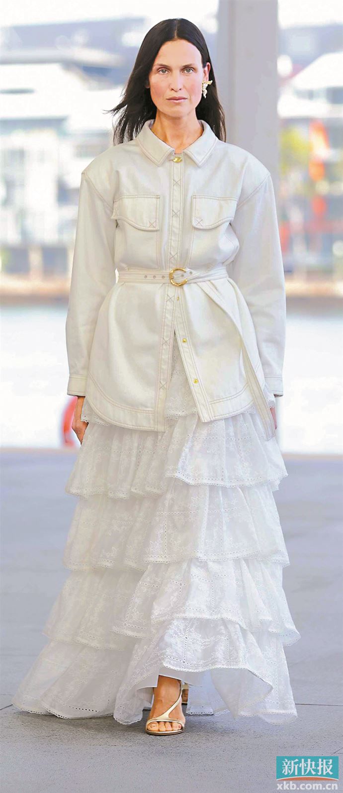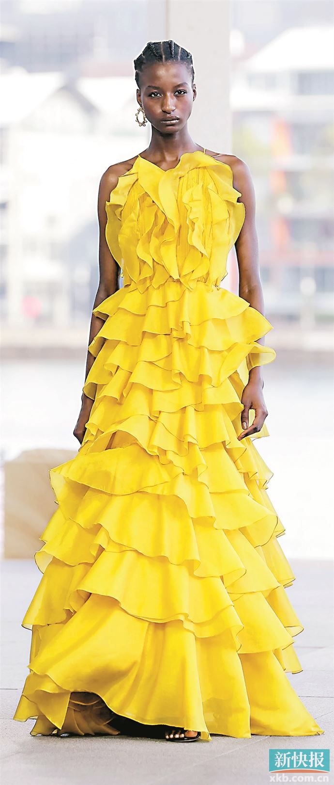 除了裙摆,领口与肩线的不对称层叠也极具特色,有的采用单肩设计即一侧肩线无装饰,简洁利落,而另一侧肩线则层叠荷叶边或蕾丝,从肩线延伸至腰线,形成不对称层叠效果,既修饰肩颈线条,又增添个性;有的则将领口设计为不对称结构,一侧领口层叠褶皱,另一侧领口简洁流畅,搭配层叠的裙摆,令整体造型穿搭既灵动又错落有致不呆板。(记者 梁彧)