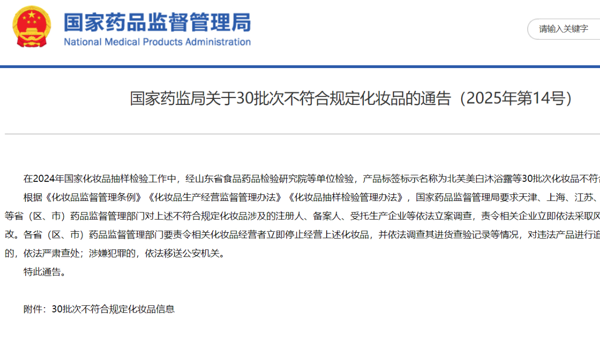 國家藥監(jiān)局關(guān)于30批次不符合規(guī)定化妝品的通告(2025年第14號)