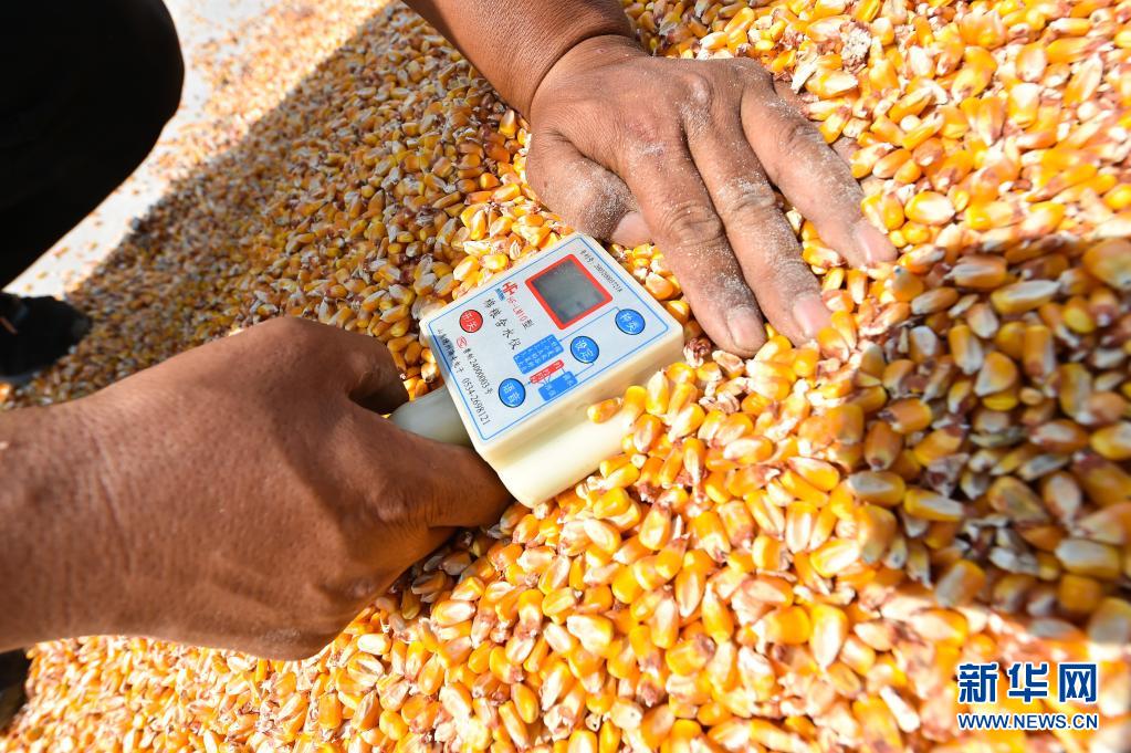 在山西省運(yùn)城市萬榮縣南張鄉(xiāng)太趙村,種糧戶李挺用儀器測量玉米的含水量(2020年9月20日攝)。據(jù)李挺介紹,農(nóng)機(jī)GPS定位、無人機(jī)噴灑農(nóng)藥、機(jī)械化收割等已滲透到農(nóng)業(yè)生產(chǎn)的各個環(huán)節(jié),臉朝黃土背朝天的農(nóng)民變成了指揮機(jī)器高效種糧的“新農(nóng)夫”。