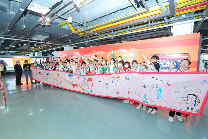 在現(xiàn)場,為了慶祝這場期待已久的航天科普展開幕,孩子們用一份“特別的禮物”——一幅繪滿了航天夢想與武漢名勝的5米長卷獻禮中國航天。在這幅長卷上,孩子們不僅生動地描繪出了武漢的眾多名勝特色,還用天馬行空的想象力展現(xiàn)了自己的航天夢。展區(qū)內(nèi),孩子們在講解員的帶領(lǐng)下參觀形形色色的“國之重器”,了解中國航天發(fā)展史,并且通過VR等設(shè)備親自體驗了一把“太空旅行”。在航天夢想體驗營中,孩子們一起回顧了空間站發(fā)射的精彩瞬間,當(dāng)看到“長五B”成功升空時,現(xiàn)場爆發(fā)出熱烈的歡呼和掌聲,加油聲此起彼伏,許多孩子還合唱《明天會更好》對中國航天獻上祝福。