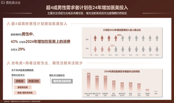 此外,根据中国整形美容协会、德勤中国等机构联合发布的《中国医美行业2024年度洞悉报告》显示,2023年,男性在医美消费上的支出同比增加了27%。在接受调研的男性中,43%计划在2024年增加在医美上的消费,这一比例高于女性群体。其中,去皱抗衰类项目尤为受到关注。