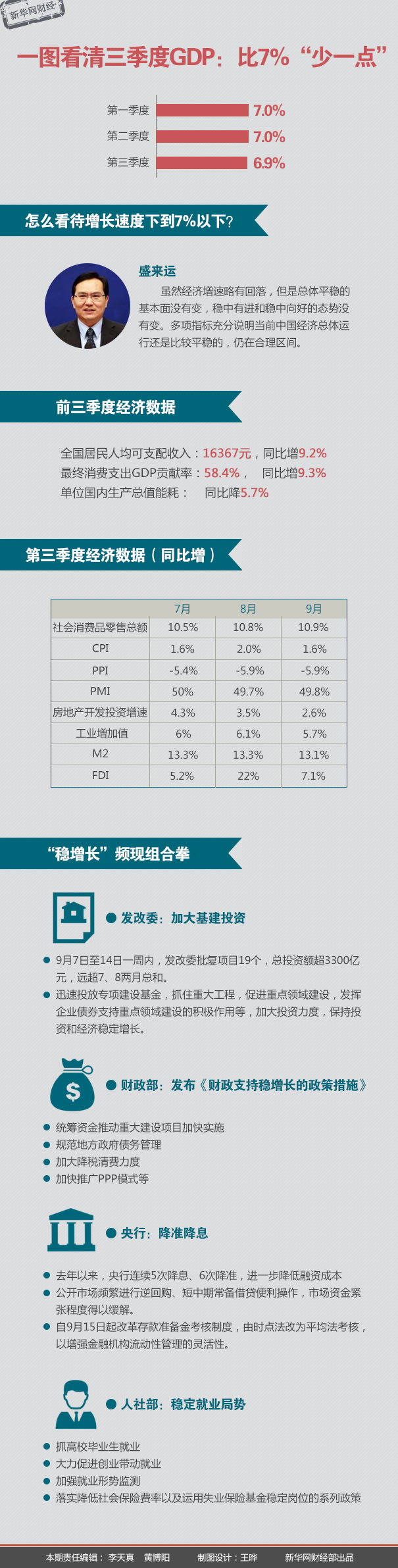 ????新華網(wǎng)北京10月19日電(記者 徐曼曼)備受關(guān)注的中國(guó)經(jīng)濟(jì)“三季報(bào)”今日揭開(kāi)面紗。國(guó)家統(tǒng)計(jì)局?jǐn)?shù)據(jù)顯示,三季度GDP同比增幅為6.9%,創(chuàng)下自2009年以來(lái)的最低增速,系官方首次以分季方式核算的GDP數(shù)據(jù)。初步核算,前三季度國(guó)內(nèi)生產(chǎn)總值487774億元,按可比價(jià)格計(jì)算,同比增長(zhǎng)6.9%。