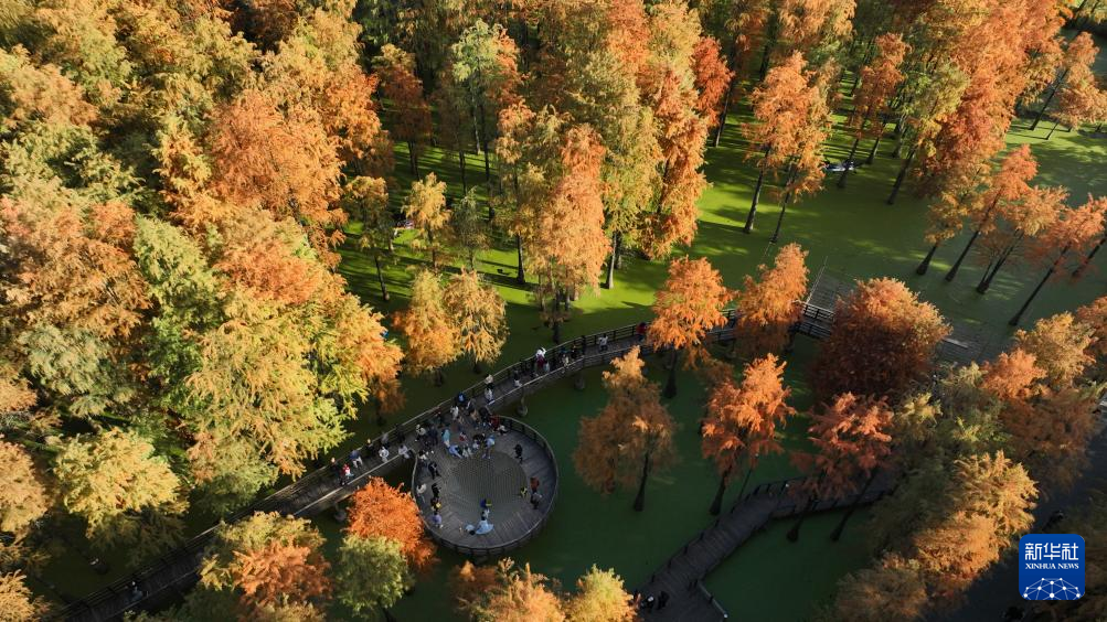 随着气温降低,浙江省杭州市青山湖的近百亩池杉、落羽杉披上色彩斑斓的“衣装”,和水面碧绿的浮萍相映成景。