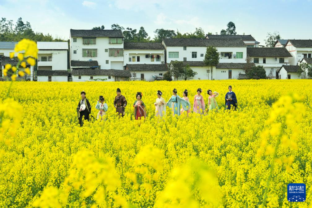 3月5日,一群穿着古装的游客在四川省广安市广安区花桥镇粮油现代农业园区油菜花田中游玩打卡。