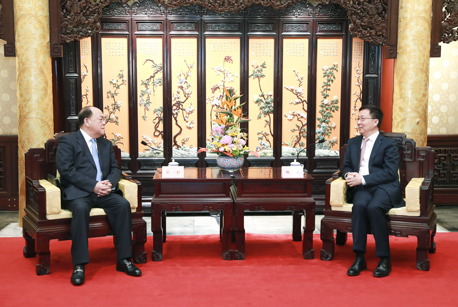 3月6日,中共中央政治局常委、國務院副總理韓正在北京釣魚臺國賓館會見澳門特別行政區(qū)行政長官賀一誠。新華社記者 龐興雷 攝