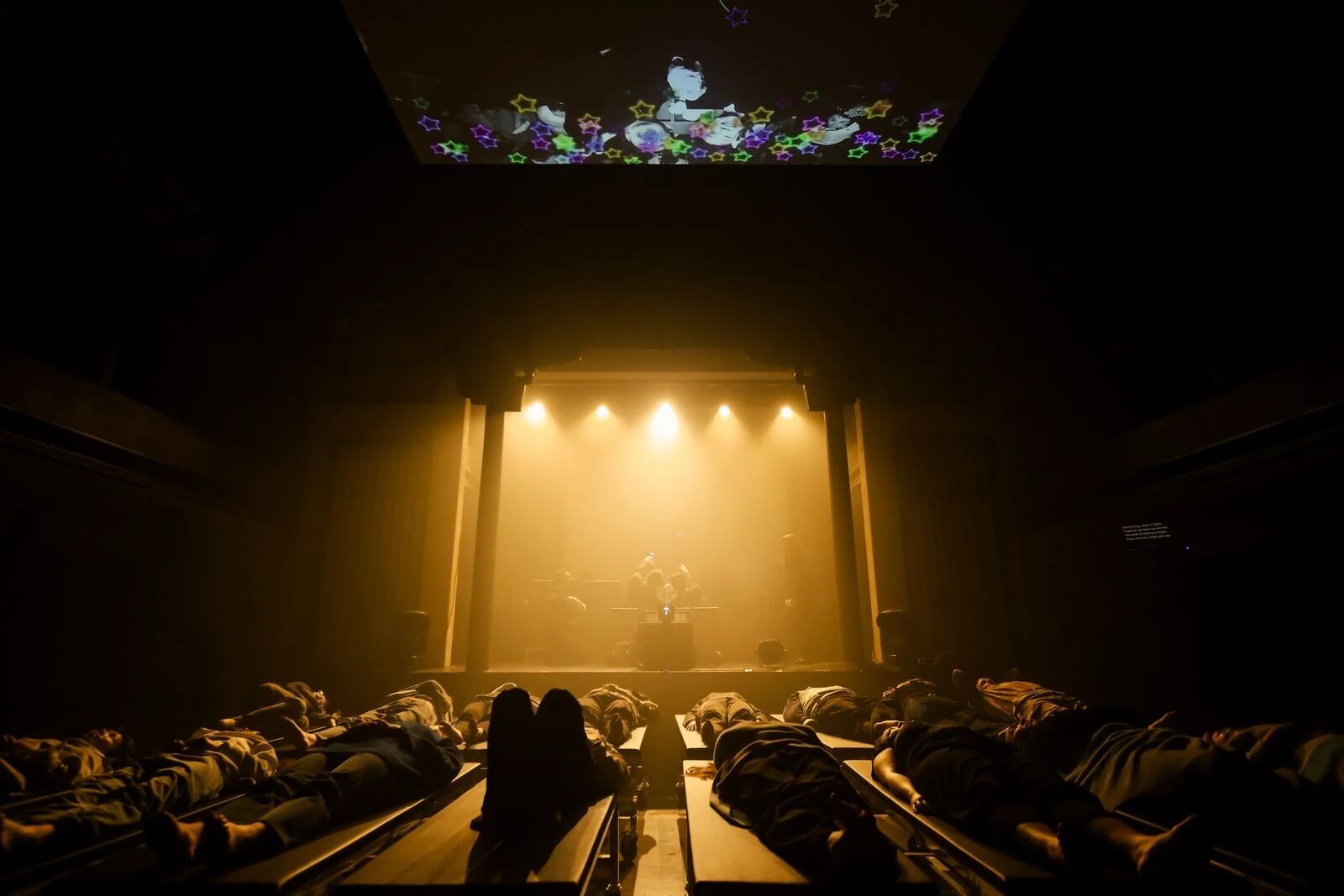 身着黑衣的工作人员轻轻推来移动躺床,依照指引,每一位体验者依次平躺下来。随即,床体轻移,他们逐一被推上舞台。24个人卧于榻上,在昏暗光线中围作椭圆的阵型,仿佛进行一场静默的仪式。
