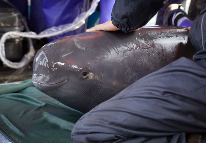 在江西鄱阳湖松门山水域,科研人员一边为江豚体检,一边用手安抚。当天,江西省在鄱阳湖松门山水域联合开展长江江豚迁地保护行动(2023年2月15日摄)。新华社记者 万象 摄