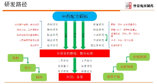 中藥配方顆粒的研制路線是從產(chǎn)品研制開始,要經(jīng)過標準復核、現(xiàn)場檢查、專家評審等環(huán)節(jié),最終需獲得藥監(jiān)管理部門的備案許可。研制路徑的重點主要是前期大量文獻的調(diào)研、過程中質量控制的一致性研究和工藝的穩(wěn)定性、有效性再評價等,對企業(yè)的研發(fā)、人才及經(jīng)濟方面的投入要求非常高。