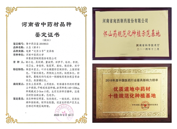 仲景宛西制藥是國內(nèi)首家提出“藥材好,藥才好”理念的企業(yè),有自建的中藥材種植基地,藥材地道,藥源清晰。是最早一批通過中藥材生產(chǎn)管理規(guī)范(GAP)認證的企業(yè)之一,得到了政府部門、行業(yè)協(xié)會等社會各界廣泛認可。其中懷山藥、懷地黃基地被授予“河南省規(guī)范化種植示范基地”、山茱萸基地“中國優(yōu)質地道中藥材十佳規(guī)范化種植基地”。