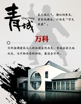 萬科 青城派 青城派擅長吐納養(yǎng)生,注重實戰(zhàn)搏擊。 萬科始終以穩(wěn)健規(guī)范的經(jīng)營作風著稱。強調(diào)建筑與人的和諧自然共生,青城派與自然萬物共存的特性,最適合萬科不過。