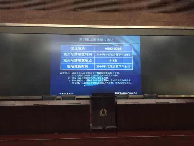 10月22日下午3點,深圳今年首宗居住用地公開掛牌出讓。根據(jù)深圳市土地房產(chǎn)交易中心9月15日下午發(fā)布的公告顯示,將出讓的該宗居住用地宗地號為A802-0305,位于龍華新區(qū)民治辦事處轄區(qū),掛牌起始價252500萬元(25.25億元),土地用途為居住用地,土地面積46646.77平方米,建筑面積186500平方米,土地使用年限70年。記者現(xiàn)場了解,共有7家競買人參與競拍,首輪報價,拿3號牌的競買人應價。