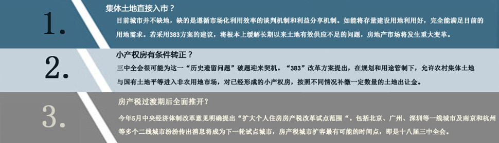 | 隨著十八屆三中全會的臨近,國務(wù)院發(fā)展研究中心專家的“383報(bào)告”引起熱議。 具體到房地產(chǎn)領(lǐng)域,“383方案”中共提到土地改革、小產(chǎn)權(quán)房、金融改革以及房產(chǎn)稅三個(gè)方面,與近期業(yè)內(nèi)討論很多的房地產(chǎn)長效調(diào)控機(jī)制相關(guān)。 "土改"將成新的突破點(diǎn),為樓市變革指明新的方向。 [詳細(xì)] |