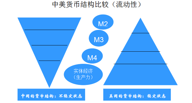 從M3或更多的貨幣層次考察,情況完全不同。美國(guó)的M3達(dá)到400多萬(wàn)億人民幣,是中國(guó)的3倍,日本達(dá)300多萬(wàn)億人民幣,是中國(guó)的2倍。從M3以上的層次考察,美國(guó)的貨幣供給更多。中國(guó)的貨幣問(wèn)題不是數(shù)量問(wèn)題,主要是結(jié)構(gòu)和效率問(wèn)題。“倒三角形”的貨幣結(jié)構(gòu)表明中國(guó)金融體系不穩(wěn)定,較易發(fā)生金融動(dòng)蕩和風(fēng)險(xiǎn),中國(guó)貨幣層次中,M3以下逐步減少,越距實(shí)體經(jīng)濟(jì)貨幣越少,金融對(duì)實(shí)體經(jīng)濟(jì)的支持小。大量貨幣呈現(xiàn)高流動(dòng)性,容易引發(fā)通脹。金融資源配置效率低下,資金的信息化程度低,有效產(chǎn)出率不高。美國(guó)貨幣結(jié)構(gòu)特征是,貨幣的基礎(chǔ)層次龐大,接近實(shí)體經(jīng)濟(jì)的貨幣供給充分,金融市場(chǎng)效率高;M3、M4等吸納貨幣功能強(qiáng),有利于治理通貨膨脹,美國(guó)的貨幣層次甚至延伸到全球,為美國(guó)治理通脹提供了充分的工具。