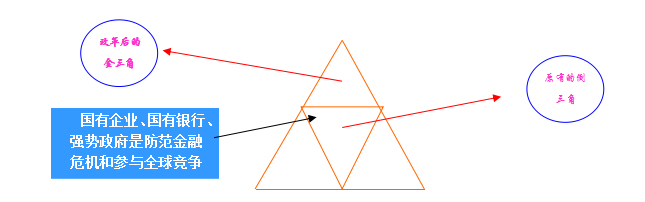 在當(dāng)前情況下,中國(guó)的金融、經(jīng)濟(jì)和政府都是一種“倒三角”的結(jié)構(gòu),如圖中的白色部分。這種結(jié)構(gòu)不穩(wěn)定,風(fēng)險(xiǎn)較大,不利于經(jīng)濟(jì)結(jié)構(gòu)的調(diào)整和經(jīng)濟(jì)的可持續(xù)發(fā)展。金融業(yè)表現(xiàn)為銀行過(guò)大,直接融資發(fā)展嚴(yán)重滯后,金融資源向國(guó)有企業(yè)和政府集中,中小企業(yè)和民營(yíng)企業(yè)融資非常困難。經(jīng)濟(jì)結(jié)構(gòu)的倒三角表現(xiàn)為近幾年,國(guó)進(jìn)民退,央企、國(guó)企很大,而民營(yíng)企業(yè)和中小企業(yè)萎縮。政府結(jié)構(gòu)表現(xiàn)為上強(qiáng)下弱,權(quán)力大服務(wù)小,人治大,法治小。有人建議推倒重來(lái),這是不可以的,要吸取前蘇聯(lián)亡黨亡國(guó)的教訓(xùn)。應(yīng)當(dāng)繼續(xù)漸進(jìn)的增量改革,做強(qiáng)做好國(guó)有股份制銀行,大力發(fā)展資本市場(chǎng)和金融市場(chǎng),形成金三角的金融結(jié)構(gòu)。經(jīng)濟(jì)方面做好國(guó)有企業(yè),大力發(fā)展民營(yíng)企業(yè)與中小企業(yè)。政府方面要提高效率,形成高效政府和大服務(wù)的組合、依法治國(guó)與以德治國(guó)的有機(jī)結(jié)合。國(guó)有企業(yè)、國(guó)有銀行、強(qiáng)勢(shì)政府是防范金融危機(jī)和參與全球競(jìng)爭(zhēng)的保障和核心競(jìng)爭(zhēng)力。
