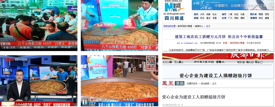 11:30許,在仁恒濱河灣建筑工地活動板房前,諾大的月餅已經(jīng)擺放在農(nóng)民工兄弟代表面前?!拔以缇吐犝f你們要來給我們送月餅,但是沒想到這個(gè)月餅居然這么大!”來自廣西的小姚不禁感嘆道。據(jù)記者了解,小姚雖然今年只有29歲,但是已經(jīng)做建筑工人快10年了。2011年帶女兒一起來到成都,足足已有三年沒有和家人一起過中秋節(jié)了。
