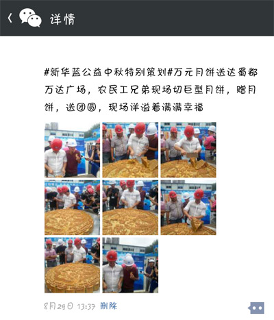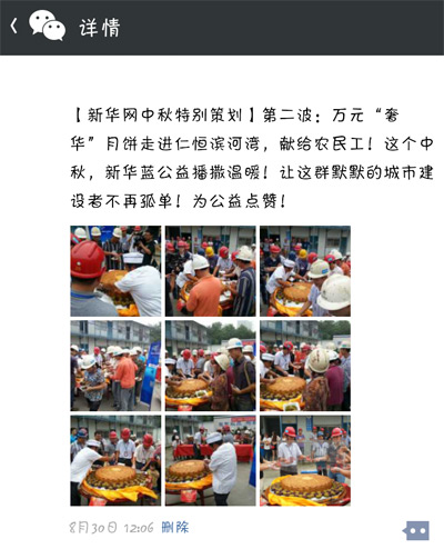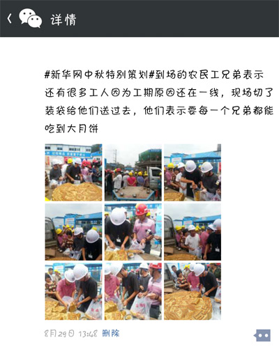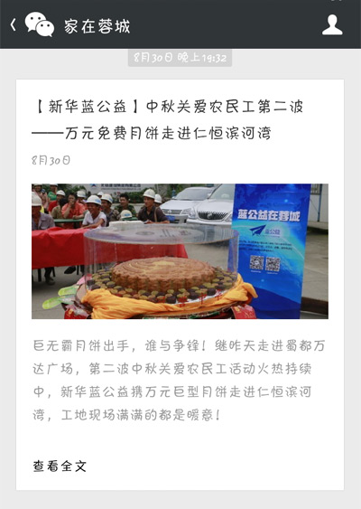 為了給這些身在異鄉(xiāng)的農(nóng)民工兄弟送去溫暖,新華藍(lán)公益特別為他們舉辦了一場“中秋關(guān)愛農(nóng)民工特別活動”,現(xiàn)場為工人捐贈月餅。8月29日上午10:30,本次活動在成都沙灣會展中心如期啟動。