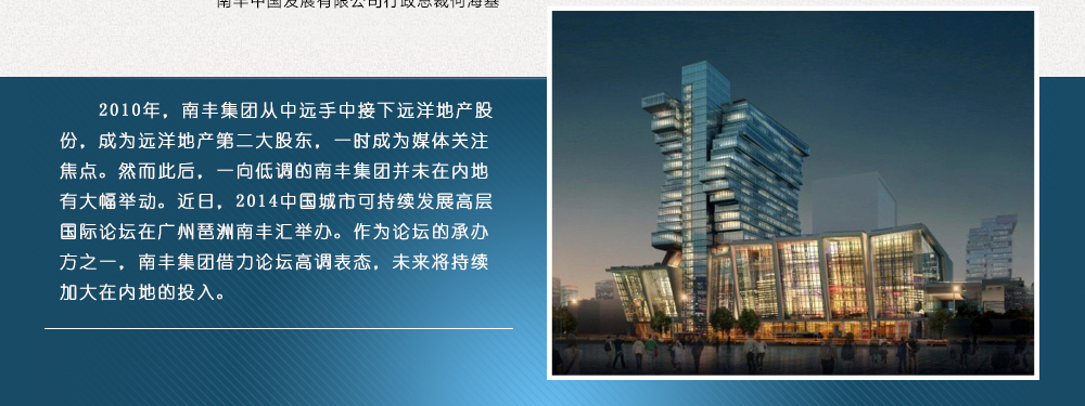 已在內(nèi)地三亞、北京、大連等地有多個項目的南豐中國是南豐集團最接內(nèi)地“地氣”的公司,也更為熟悉內(nèi)地市場與政策。何海基認為當(dāng)下中國城市可持續(xù)發(fā)展的趨勢使企業(yè)必須在做項目之前就考慮到幾年后買房及用辦公樓的人們對低碳、智慧等需求。【詳情】