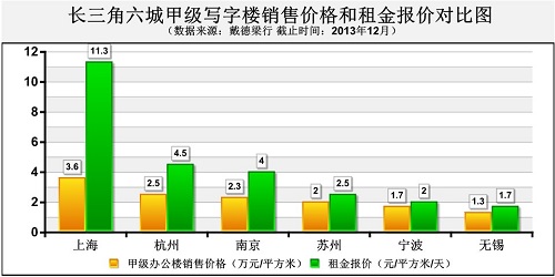 僅以蘇州為例,其甲級辦公寫字樓的平均售價已奔至“2字頭”;租金報價與南京同類物業(yè)的差距也已縮小至1.5元/平方米/天。 |