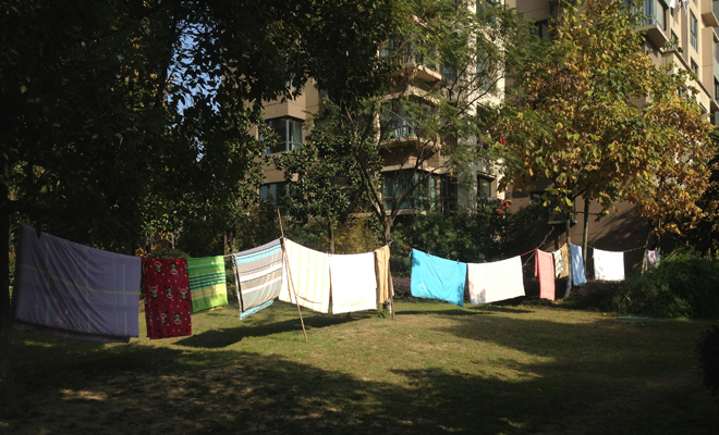 同時(shí),記者還看到,不少業(yè)主將繩子綁在小區(qū)樓宇空地間的大樹上,然后晾掛起棉被和衣物,如此做法讓小區(qū)看上去極不美觀。