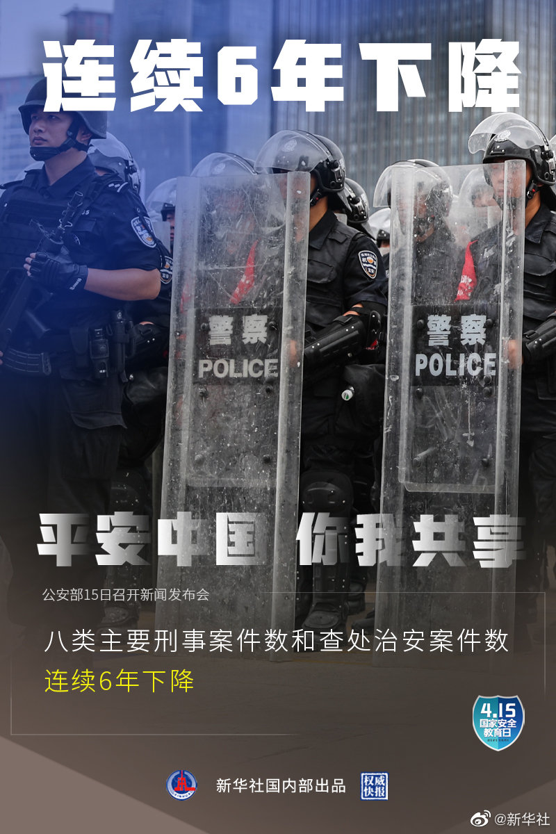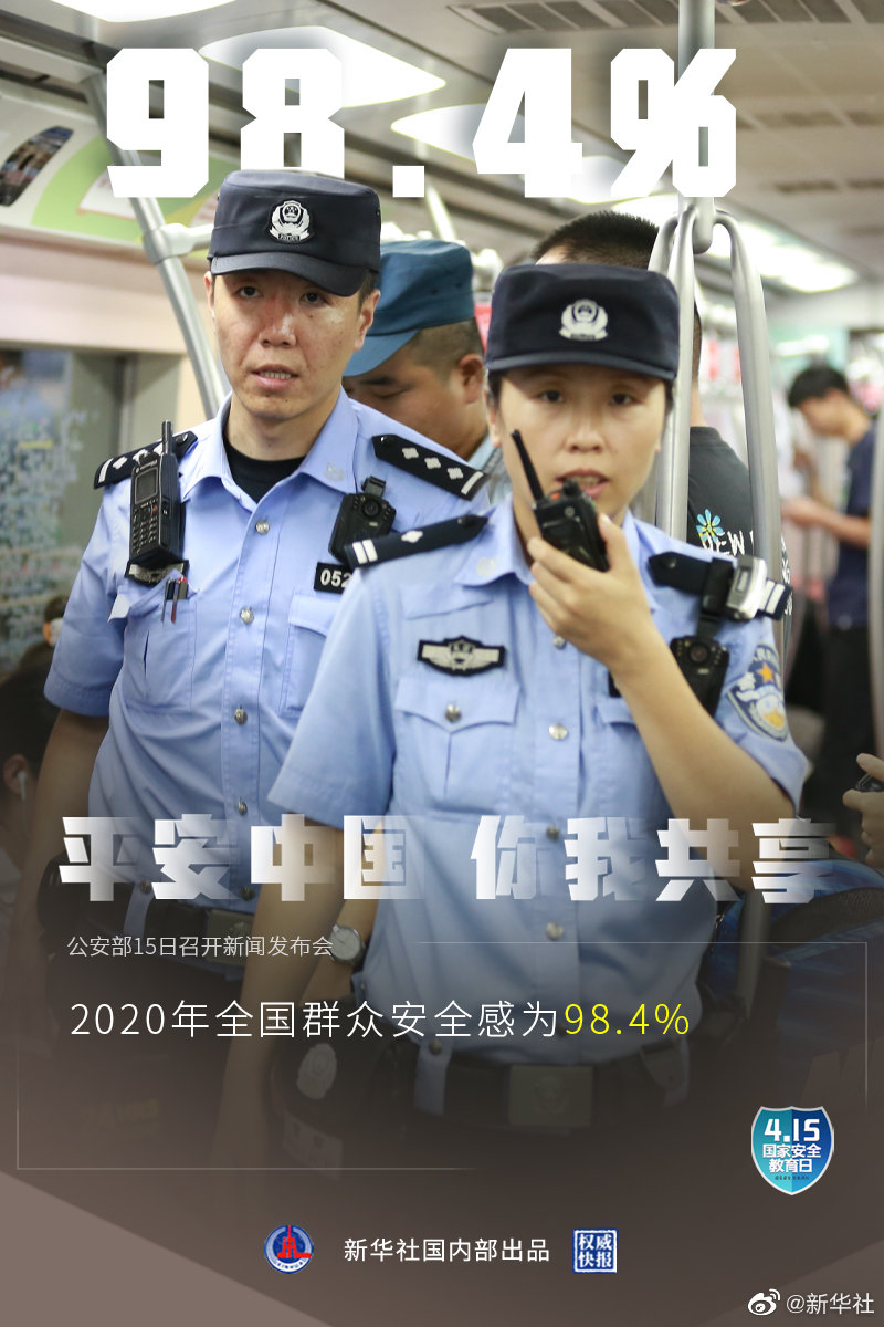 4月15日是第六個(gè)全民國(guó)家安全教育日,公安部15日召開新聞發(fā)布會(huì)介紹:2020年全國(guó)群眾安全感為98.4%,全國(guó)居民對(duì)社會(huì)治安滿意度達(dá)83.6%。截至2020年,全國(guó)刑事案件立案總量連續(xù)5年下降,八類主要刑事案件數(shù)和查處治安案件數(shù)連續(xù)6年下降。(記者熊豐,海報(bào)設(shè)計(jì)張晨光)