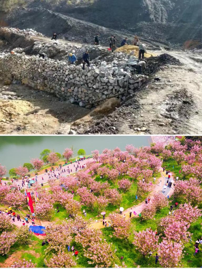 拼版圖片:上圖,安源區(qū)城郊管委會略下村生態(tài)修復前礦山裸露;下圖,生態(tài)修復后“陽光花?!本跋?。(萍鄉(xiāng)市委宣傳部供圖)