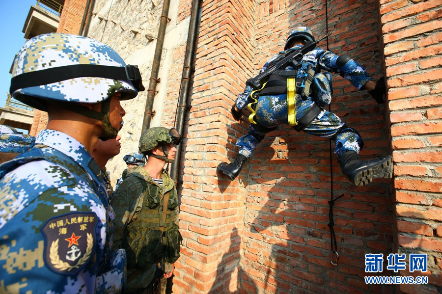 ??? 9月13日,中俄海軍陸戰(zhàn)隊隊員進行建筑物攀登滑降訓(xùn)練。