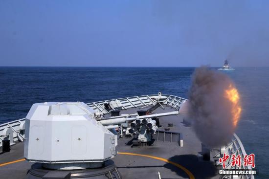 9月18日,“黃山艦”主炮開炮。當(dāng)日,中俄“海上聯(lián)合-2016”軍事演習(xí)展開實際使用武器演練。 中新社記者 韓海丹 攝