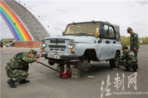 圖為二連邊防檢查站官兵對涉嫌走私車輛進行分解檢查