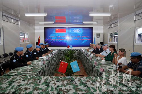 圖為維和警察防暴隊與聯(lián)利團(tuán)任務(wù)支持部主任大衛(wèi)·約翰·彭克利斯一行開展座談交流
