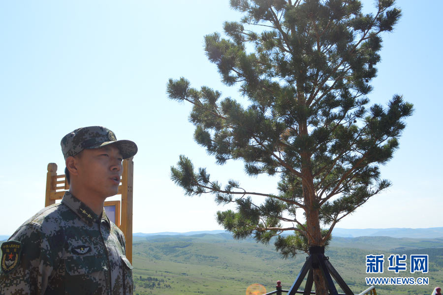 6月24日,三角山哨所,候躍敏排長(zhǎng)在樟子松旁介紹“相思樹”的故事。新華網(wǎng) 張敏彥 攝