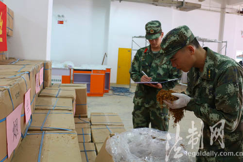圖為邊防官兵查看查獲煙絲