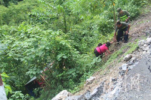 ????獲悉情況后,該所立即向百南鄉(xiāng)衛(wèi)生院通報情況,并組織官兵趕赴現(xiàn)場施救。邊防官兵在現(xiàn)場發(fā)現(xiàn)一輛三輪車側翻在半山坡,山坡下是10多米深的河流?!昂迷谟袠鋽r住,要不然后果不敢想象?!眹^群眾李師傅說道。