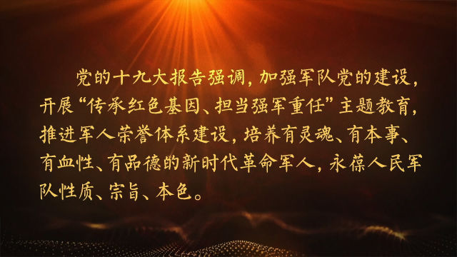 黨的十九大報告強調(diào),加強軍隊黨的建設,開展“傳承紅色基因、擔當強軍重任”主題教育,推進軍人榮譽體系建設,培養(yǎng)有靈魂、有本事、有血性、有品德的新時代革命軍人,永葆人民軍隊性質(zhì)、宗旨、本色。