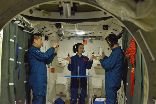 ????2013年5月22日,航天員王亞平(中)、聶海勝(右)、張曉光在模擬天宮一號(hào)組合體內(nèi)進(jìn)行太空授課訓(xùn)練。新華社發(fā)(朱九通 攝)