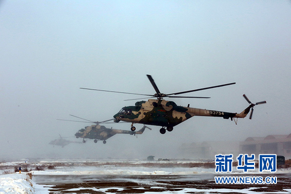 2018年1月5日,新疆軍區(qū)某陸航旅運輸直升機(jī)一營在嚴(yán)寒條件下組織飛行訓(xùn)練。 新華社發(fā)(吳世科 攝)