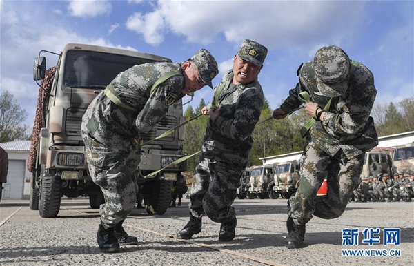 5月6日,沈陽聯(lián)勤保障中心某汽車運(yùn)輸旅一營戰(zhàn)士在軍體比武上進(jìn)行大力士拉車賽。新華社記者 許暢 攝