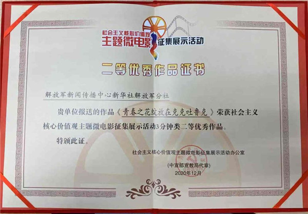 ????第四屆社會主義核心價值觀主題微電影征集展播活動評選結(jié)果日前揭曉,解放軍新聞傳播中心新華社解放軍分社申報(bào)的《青春之花綻放在克克吐魯克》獲“3分鐘類二等優(yōu)秀作品獎”。