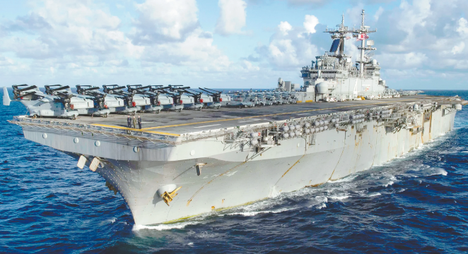 据介绍,两栖戒备群是美国海军用于干预全球事务的快速反应部队,通常由一艘两栖攻击舰和两艘大型登陆舰组成,它们会固定搭载2000名水兵和隶属海军陆战队远征部队的约2200名海军陆战队员。不同于美国陆军部队渡海作战需要较长时间的装备集结、登船和准备,两栖戒备群预先搭载有海军陆战队远征部队的配套装备和后勤物资,可以快速出动,执行从配合F-35战斗机作战,到非战斗人员撤离行动和灾难救援等各种任务。