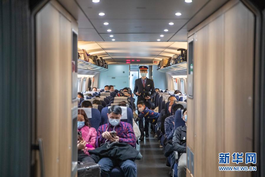 2月9日,付寶印在重慶北開(kāi)往萬(wàn)州北的C6422次列車上巡視車廂。新華社記者 黃偉 攝