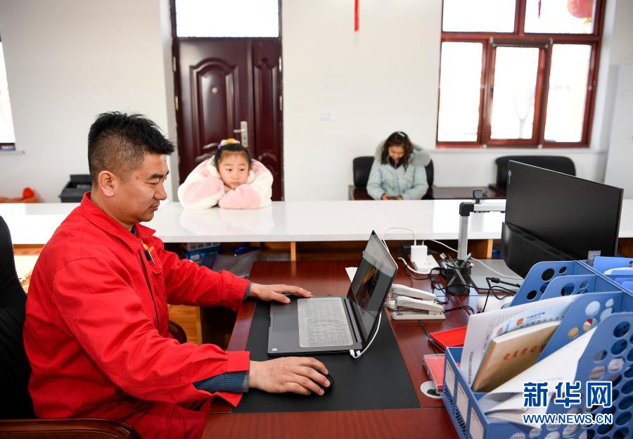 2月11日除夕當天,王濤(前)在辦公室整理資料,妻子朱海燕和7歲的女兒王思淇在一旁等候。