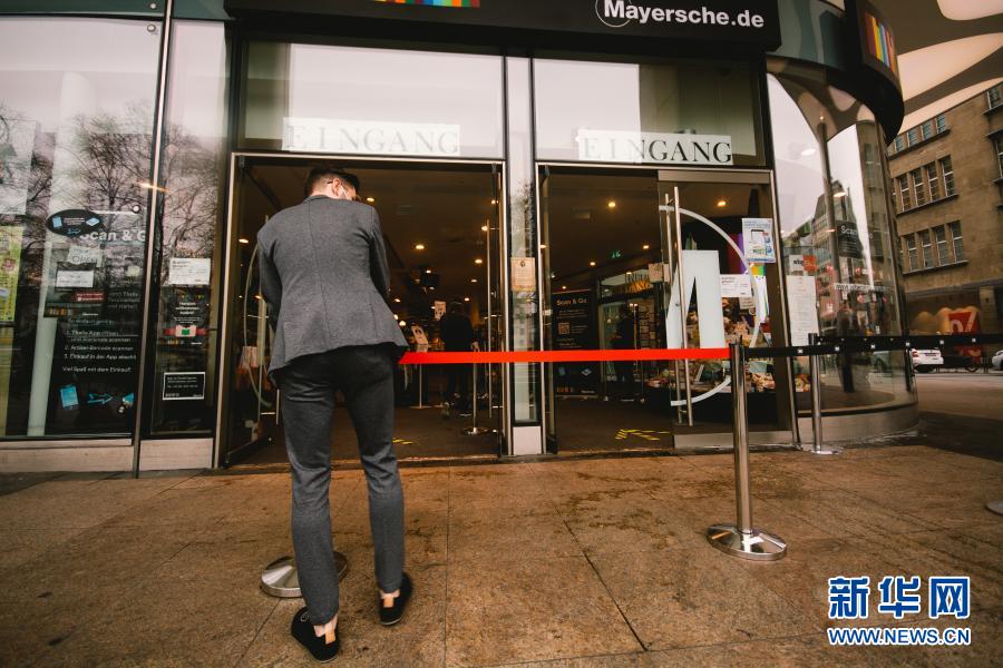 3月8日,德國科隆一家書店的工作人員在入口處拉起護欄,限制客流。