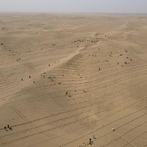 3月28日,人們在且末縣城不遠(yuǎn)處的塔克拉瑪干沙漠內(nèi)植樹(無人機照片)。
