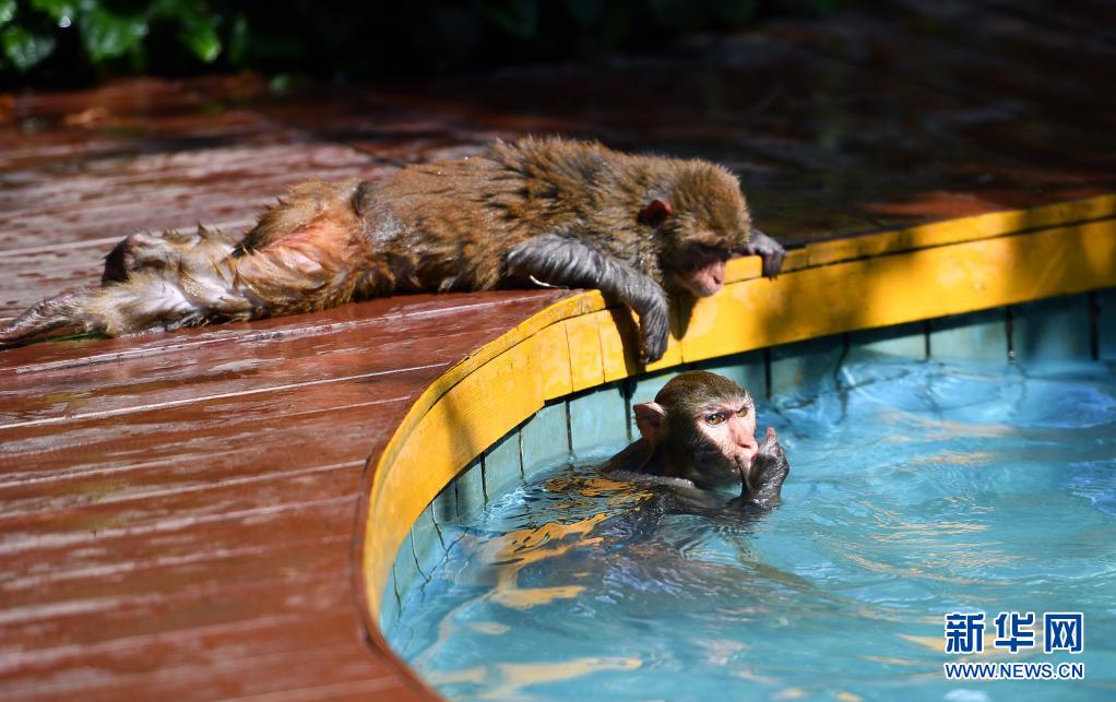 4月4日,獼猴在南灣猴島保護(hù)區(qū)里戲水。