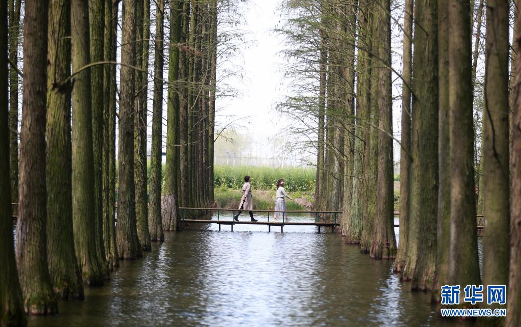 4月5日,在江蘇省揚(yáng)州市淥洋湖濕地公園,游客在水上森林中游覽。