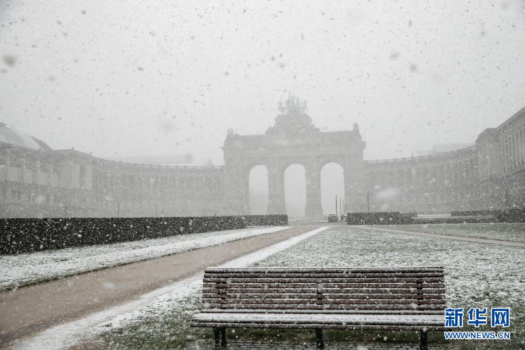 這是4月6日在比利時布魯塞爾五十周年紀(jì)念公園拍攝的雪景。
