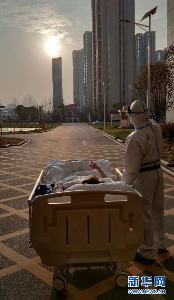 2020年3月5日傍晚,在湖北省武漢大學(xué)人民醫(yī)院東院,復(fù)旦大學(xué)附屬中山醫(yī)院支援湖北醫(yī)療隊(duì)醫(yī)生在護(hù)送患者王欣做CT的途中停下,讓住院近一個(gè)月的老人欣賞久違的日落。新華社發(fā)(甘俊超 攝)