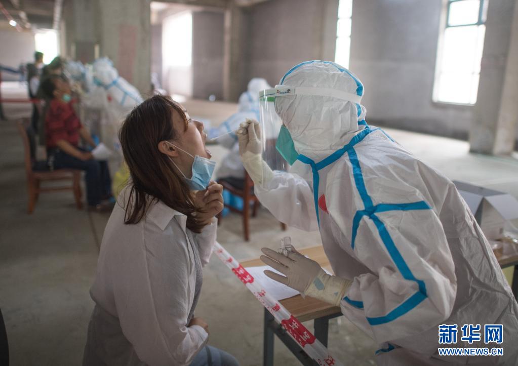 2020年5月15日,在武漢華生漢口城市廣場(chǎng)四期檢測(cè)點(diǎn),工作人員對(duì)市民進(jìn)行核酸檢測(cè)。新華社記者 肖藝九 攝