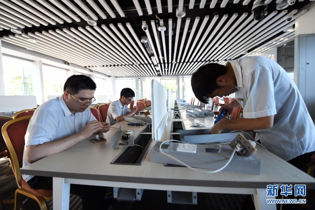 4月10日,工作人員在安裝新聞中心網(wǎng)絡(luò)設(shè)施。